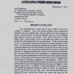 Written by Olusegun Obasanjo The controversial letter from Nigerian former Head of State: Obasanjo's 18 page letter entitled "Before it is too late", dated December 2, 2013 to the present Nigerian President Jonathan. BEFORE IT IS TOO LATE I am constrained to make this an open letter to you for a number of reasons. One, the current situation and consequent possible … [Read more...] about Obasanjo’s Letter to Jonathan